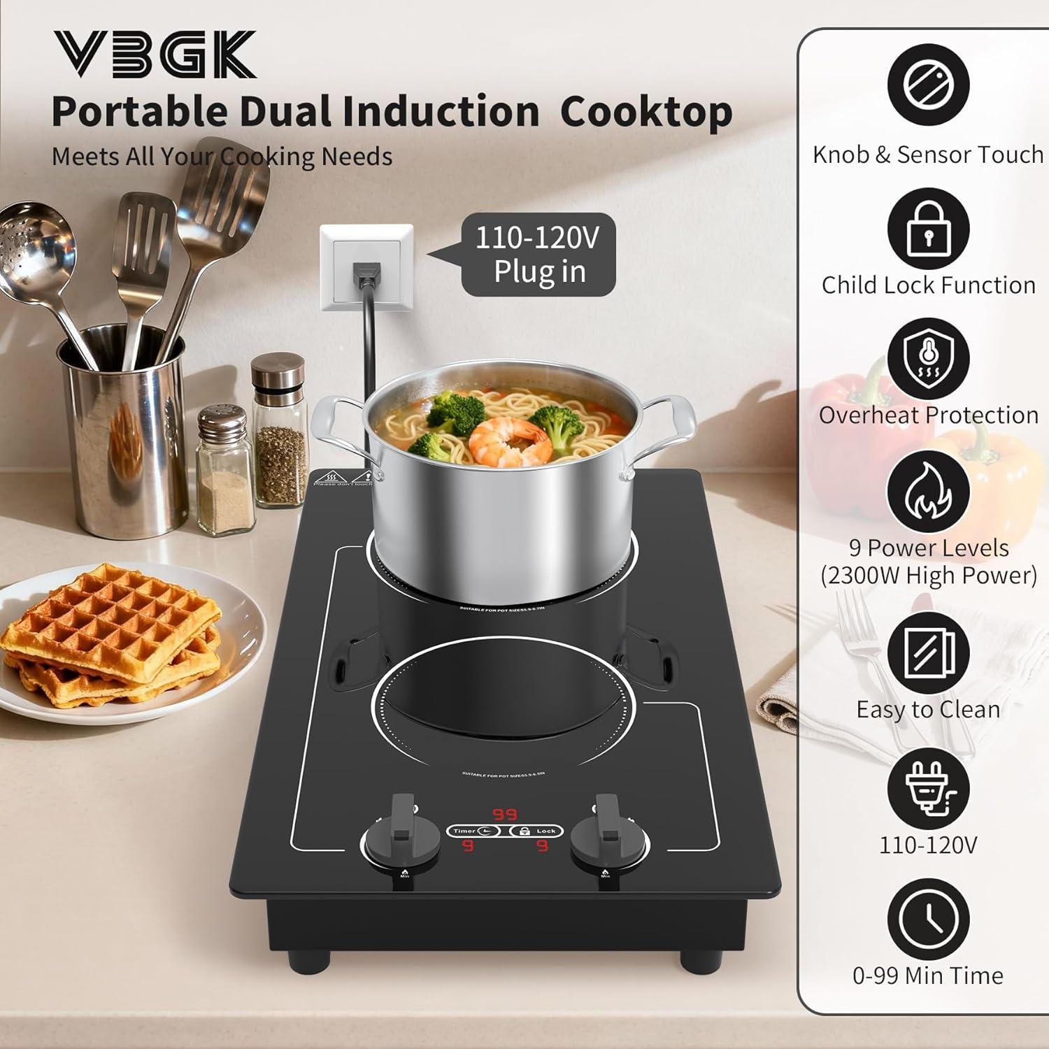 VBGK 2 burner Induction cooktop,110V 2300W double burner hot plate with LED Touch Screen, 9 Power Levels, Kids Lock & Timer, Overheat Protection, knob and touch control Double Induction Cooktop