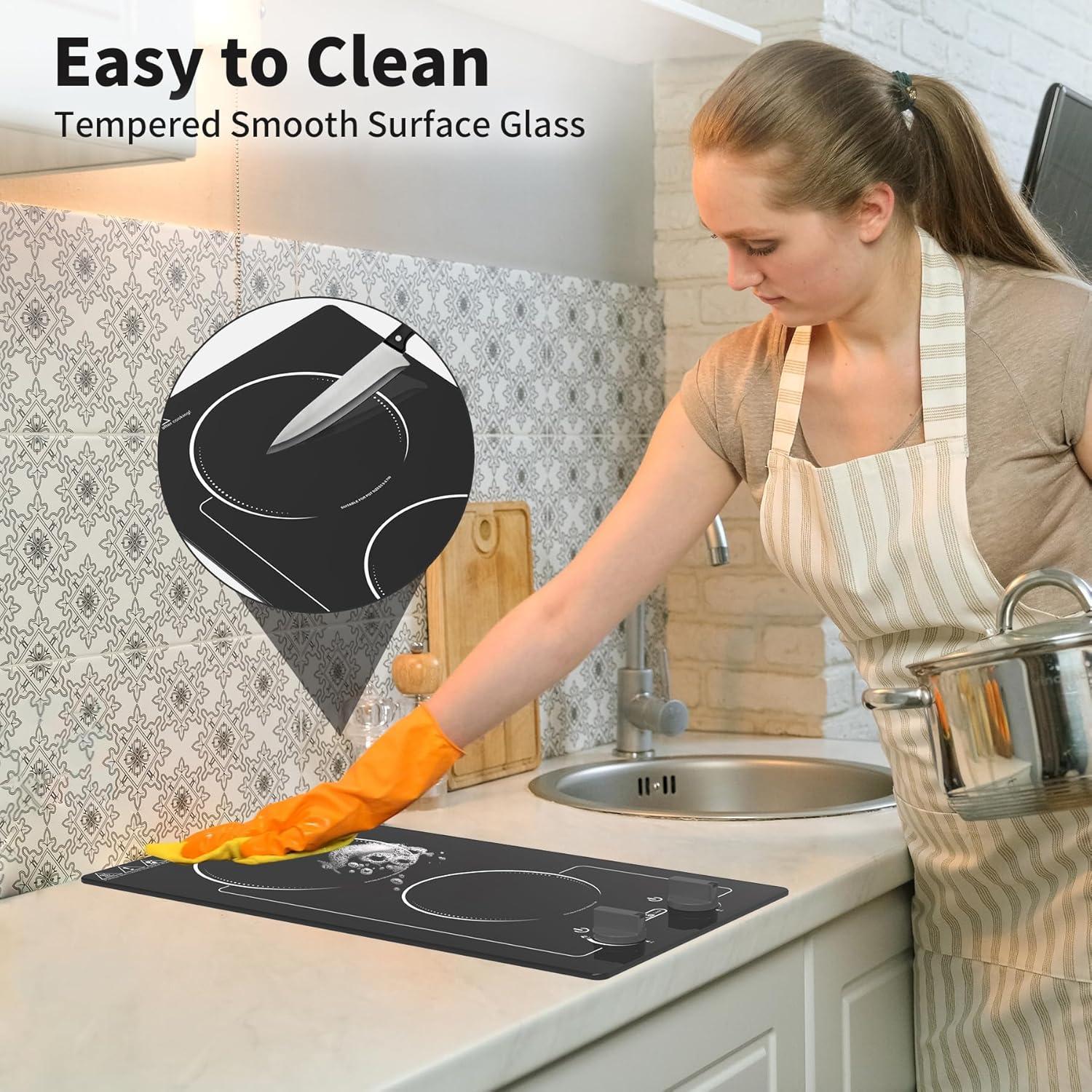 VBGK Electric Cooktop,110V 2100W electric Stove Top with Knob Control,Countertop/Built-in Design with 9 Power Levels,Kids Lock & Timer, Overheat Protection,and touch control 2 burner electric Cooktop.