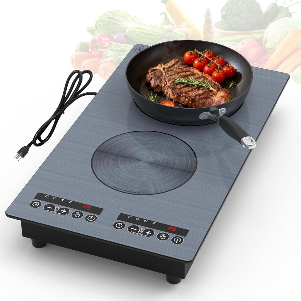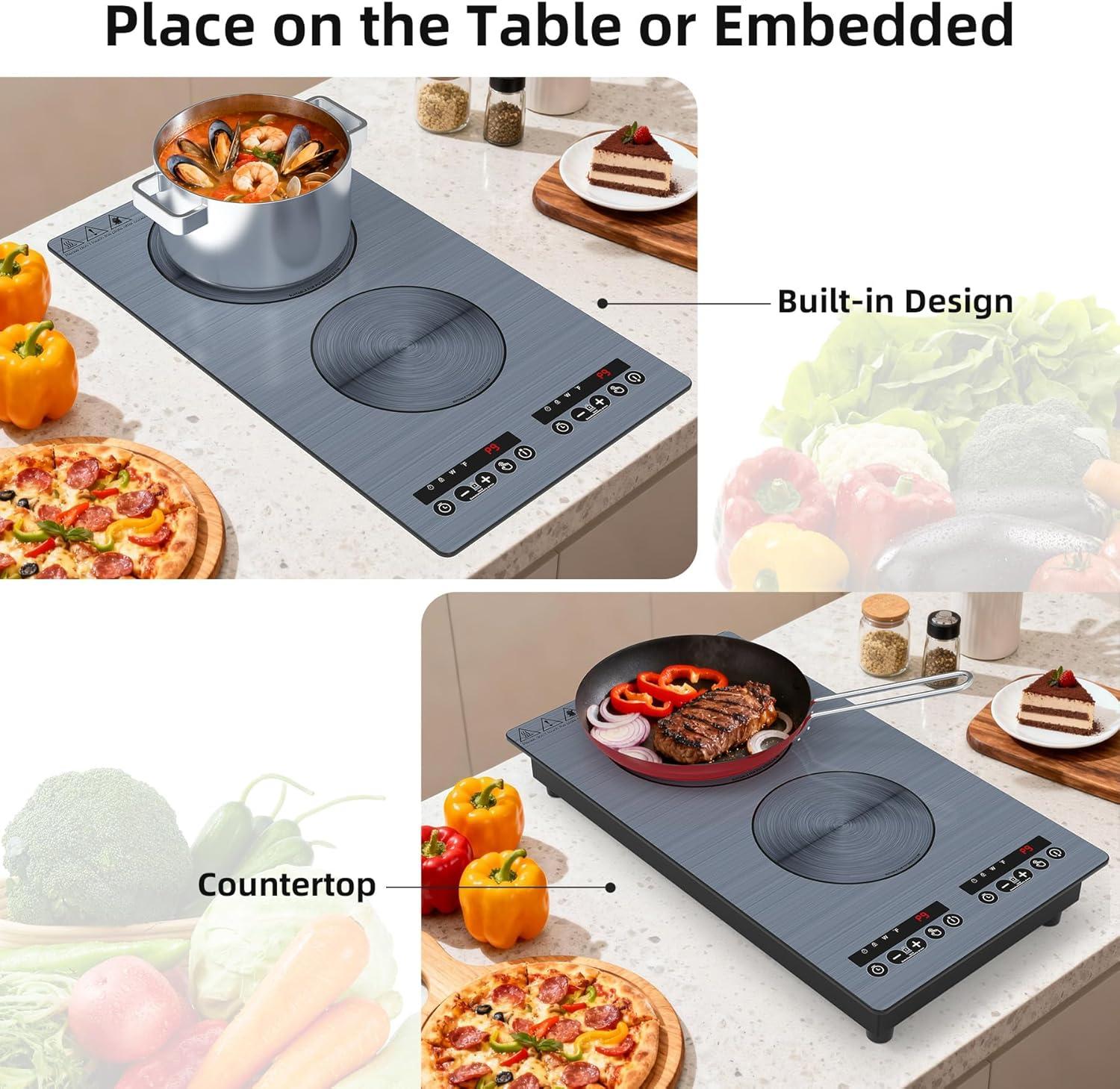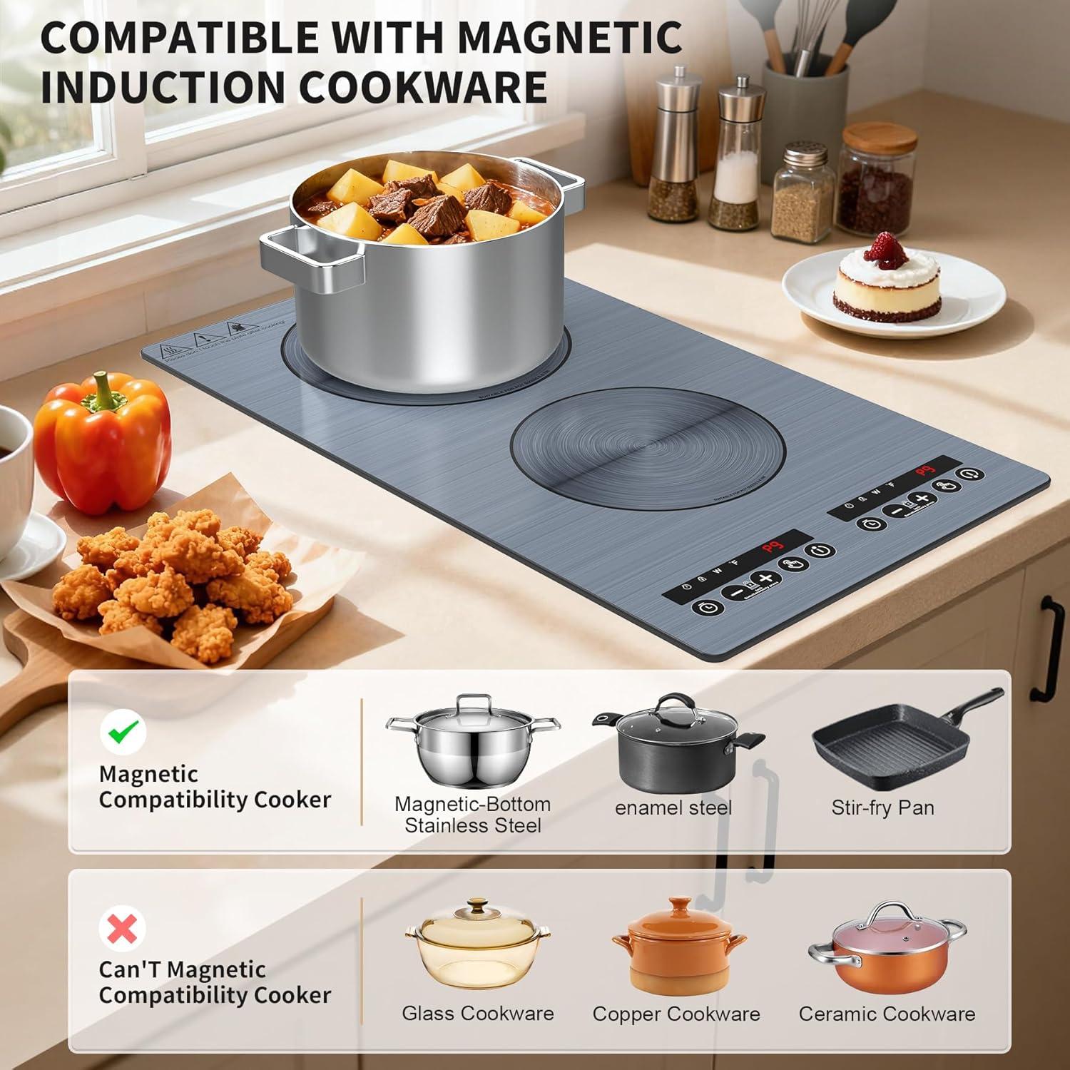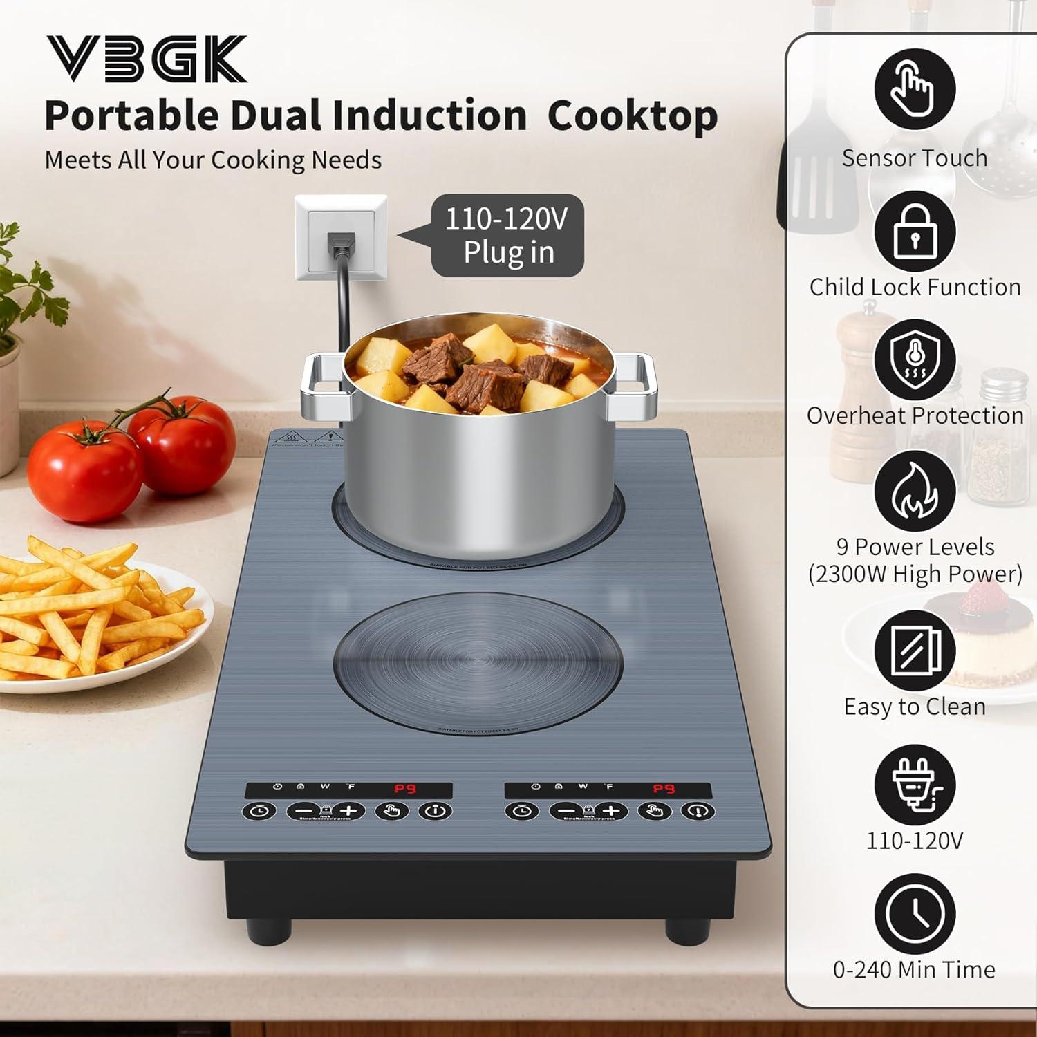Wide Range of Application: VBGK Induction Cooktop countertop burners is compatible with cast iron, iron, electromagnetic steel, enamel, and stainless steel with a magnetic bottom. double burner electric cooktop if the magnet sticks to the bottom of the cookware, it should be compatible,The portable double burner hot plate simple design makes it very suitable for home and outdoor cooking.
