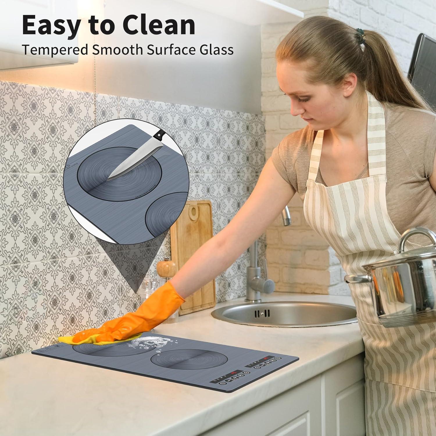 DUAL HEATING ZONES:VBGK induction stove top features two independent heating areas. 4000W which can cook 2 dishes quickly at the same time. The 2 burner induction cooktop uses 110-120 Volts of electricity—standard in all North American homes. With wire drawing ceramic glass design, the double induction cooktop looks very modern sleek.