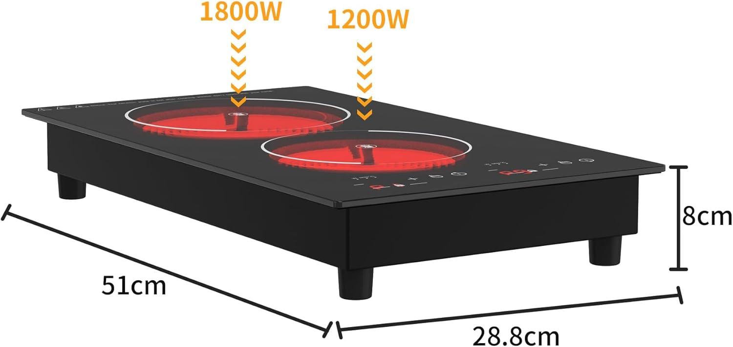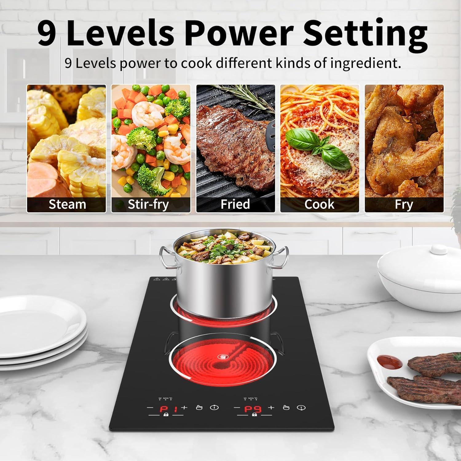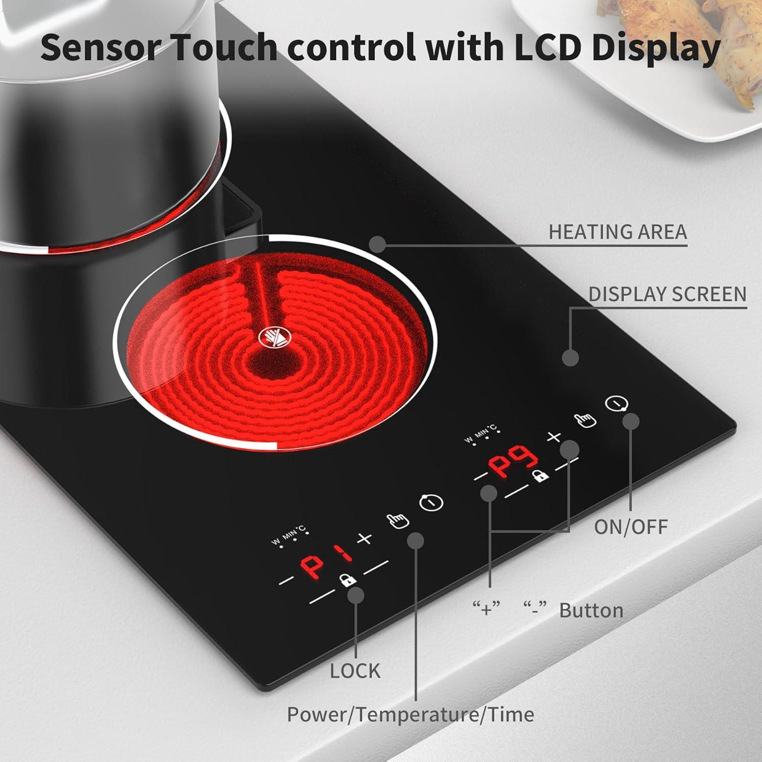 Dual Powerful Cooking Zone:VBGK 2 burner electric cooktop is equipped with two independent heating zones, allowing you to set each heating zone separately using the LED display. Independent power 1200W+900W, Electric stove top burner which can quickly cook 2 dishes of delicious dishes at the same time, saving a lot of time.