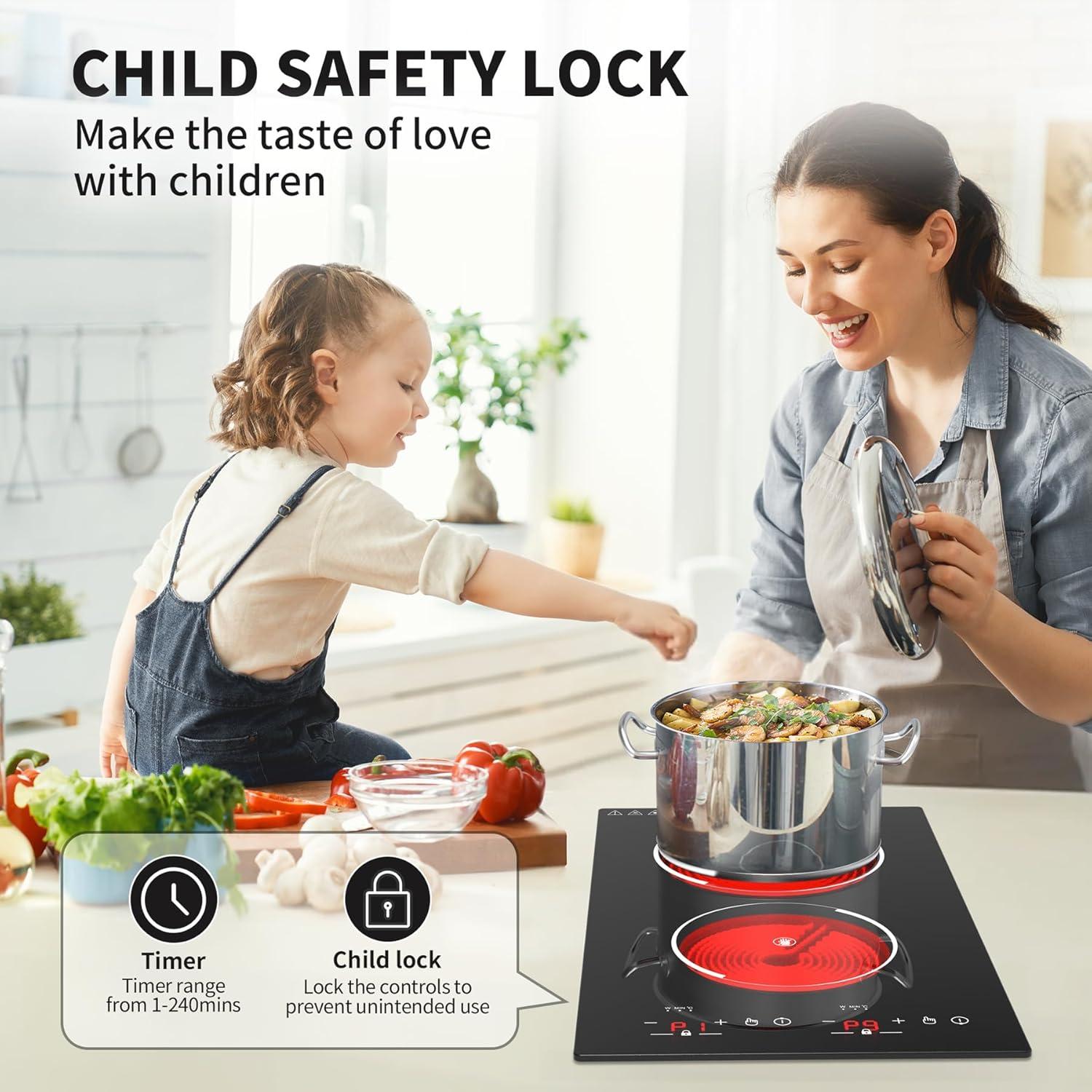Safety Double Burner Electric Cooktop:VBGK 2 burner electric stove is equipped with a child safety lock, timer and overheat protection device, and the round edges without sharp corners. Set the timer from 1 minute to 120 minutes. Just set the power setting and timer, then let the electric burner do the rest, and you can enjoy the leisure time and its excellent cooking performance.