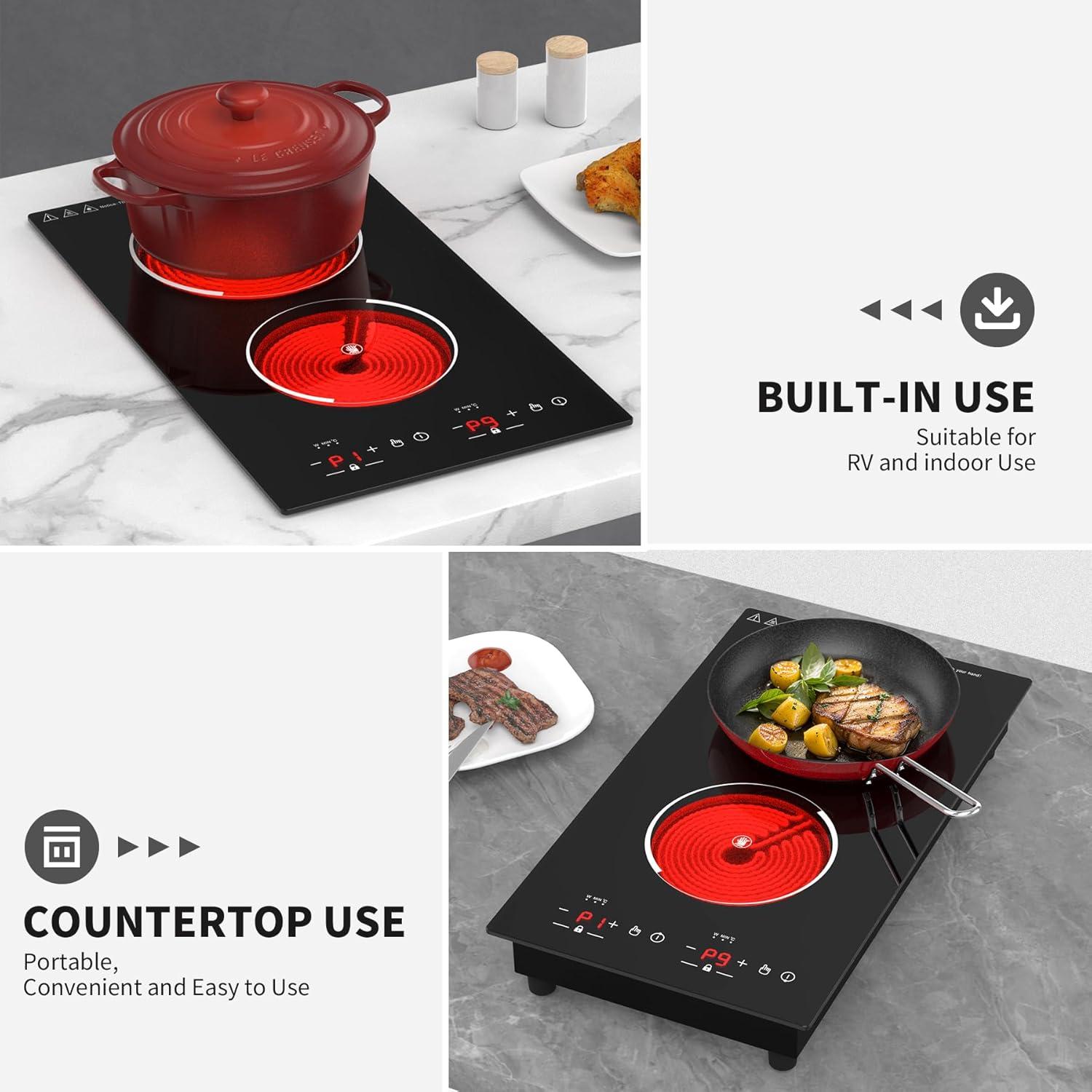 Built-in and countertop Electric cooktop 110v :This electric stove burner can be built-in or placed independently. Easy to install. 2 burner electric cooktop The smooth surface and built-in design save valuable countertop space, effortless cleaning and durable use for long time