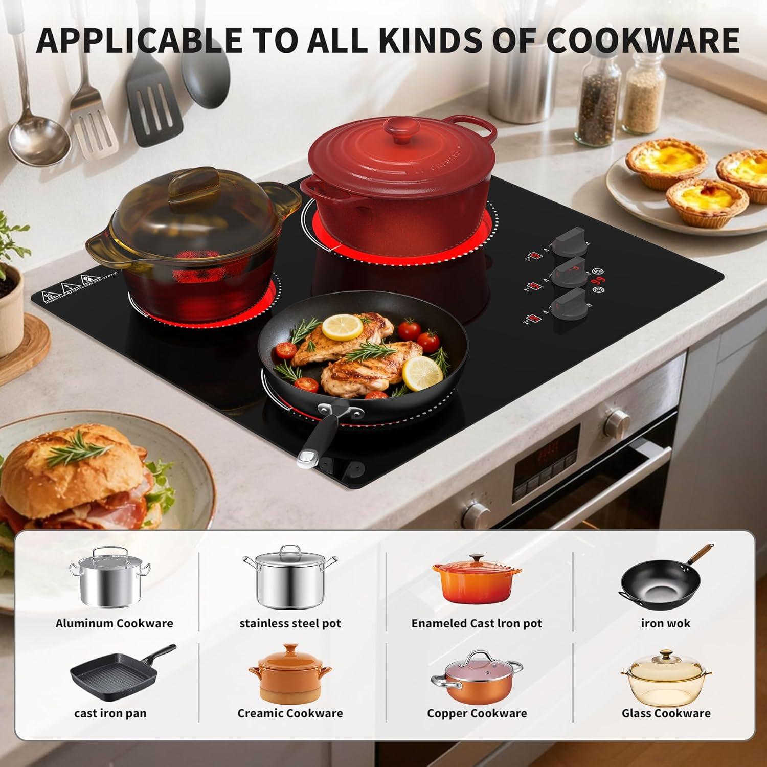 Knob & Touch Controls: VBGK Electric Cooktop 24 inch is equipped with easy-to-use knob control with a child safety lock, timer ,making it simple to operate. Electric Stove top especially convenient for the elderly and individuals with poor eyesight .The heating effect of the Electric cooktop is the same as that of the induction cooker, everyone can enjoy cooking with this electric ceramic cooktop without any obstacles!