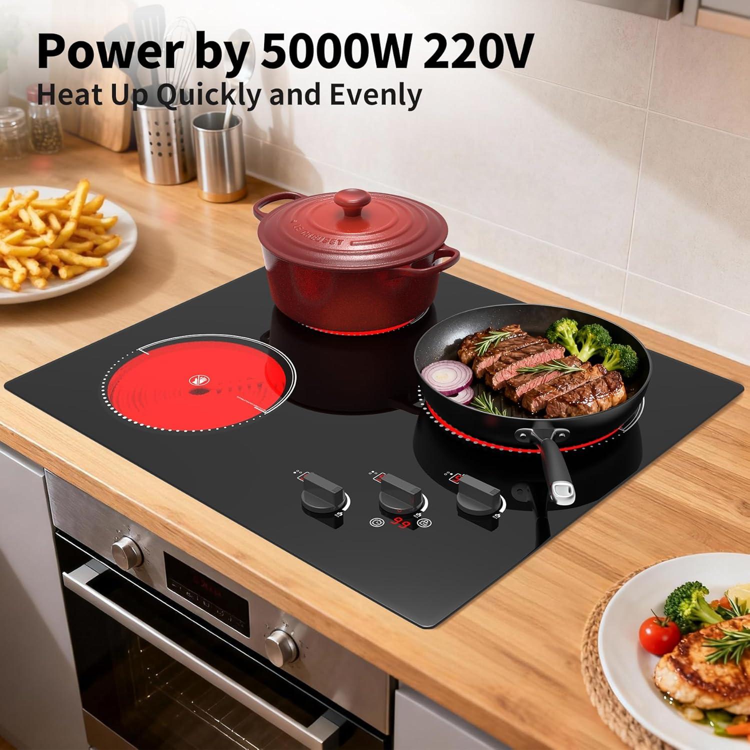 VBGK Electric Cooktop,24 inch 220V Stove Top,Touch and Knob Control,LED,9 Power Levels, Kids Lock &Timer,Overheat Protection,5000W 3 burner electric cooktop.(3 Burners Electric Cooktop)