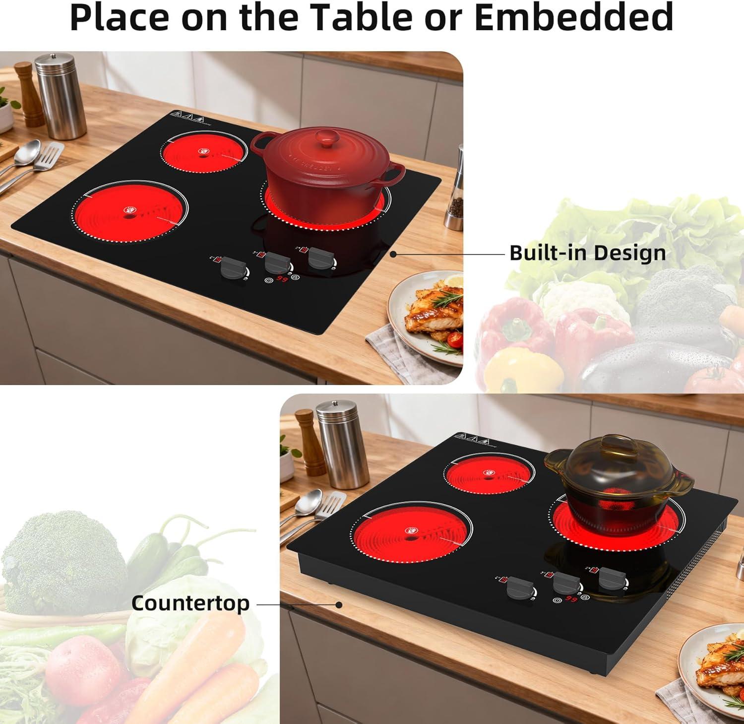Safety Electric Stove :VBGK 3 burner electric cooktop is equipped with a child safety lock, timer and overheat protection device, and the round edges without sharp corners. Set the timer from 1 minute to 99 minutes. Safe and user-friendly. you can enjoy the leisure time and its excellent cooking performance. 3 burner cooktopWith Electronic knob that makes it safer than a touch-screen button by keeping kids, family pets, and cats from mistakenly touching the switch button.